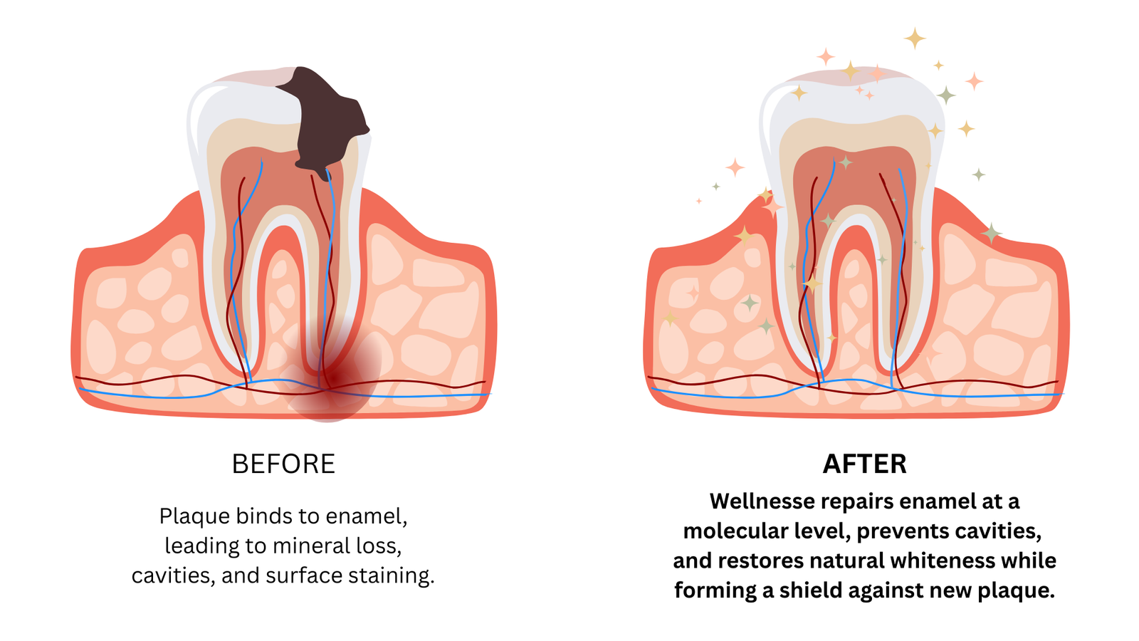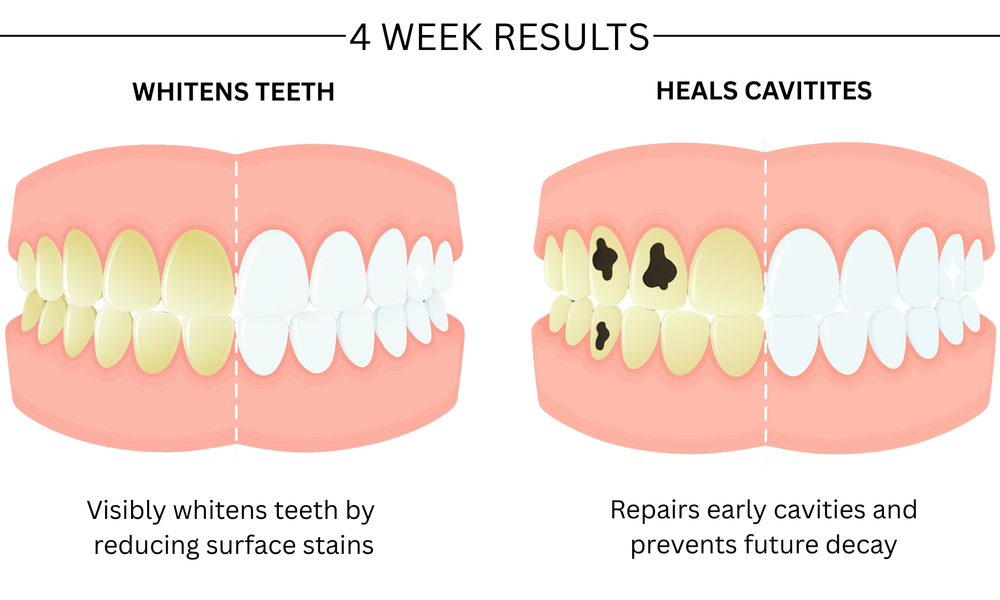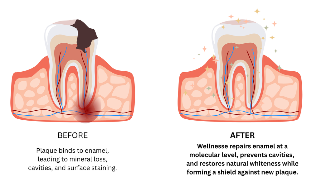 Wellnesse uses Hydroxyapatite to help remineralize teeth, heal cavities and reduce sensitivity in 98% of mouths while whitening over standard toothpaste - in just 60 days!