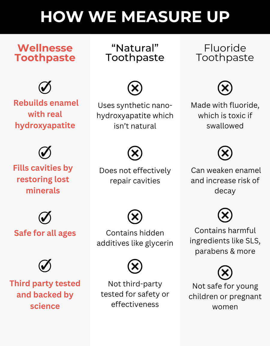 It contains hydroxyapatite, that helps support tooth enamel to keep teeth strong. Wellnesse toothpaste gets your teeth just as white (if not whiter) than everything else - without all the chemicals. Why would anyone NOT switch?”